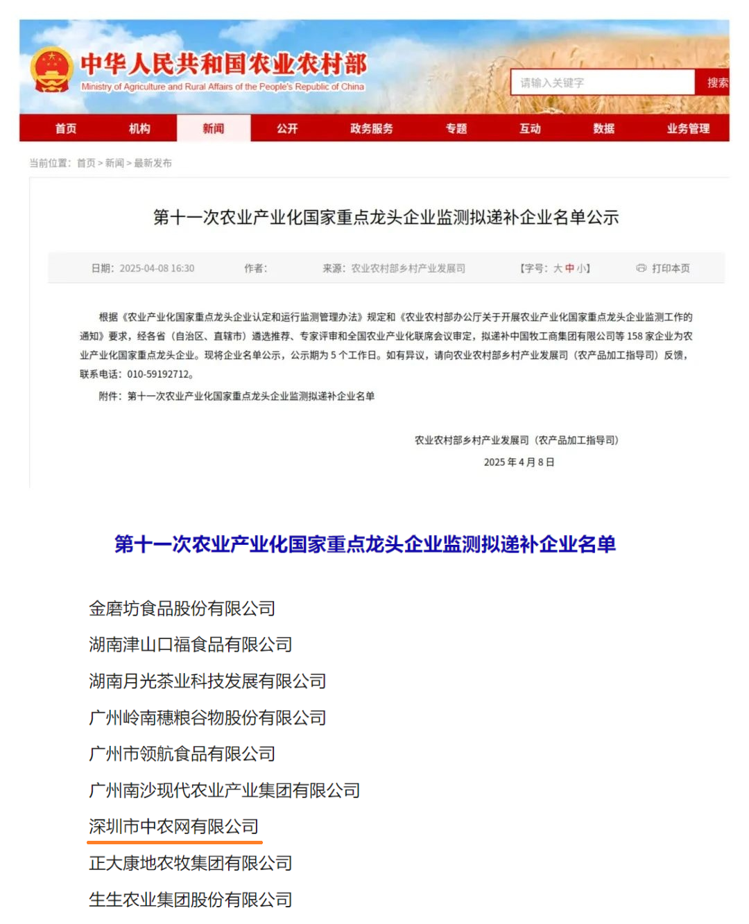 近日,,农业农村部乡村产业发展司公示,,,,拟递补158家企业为农业产业化国家重点龙头企业,,Z6尊龙旗下中农网入列其中,,,,成功实现从省级重点农业龙头企业到国家级重点龙头企业的跨越。。